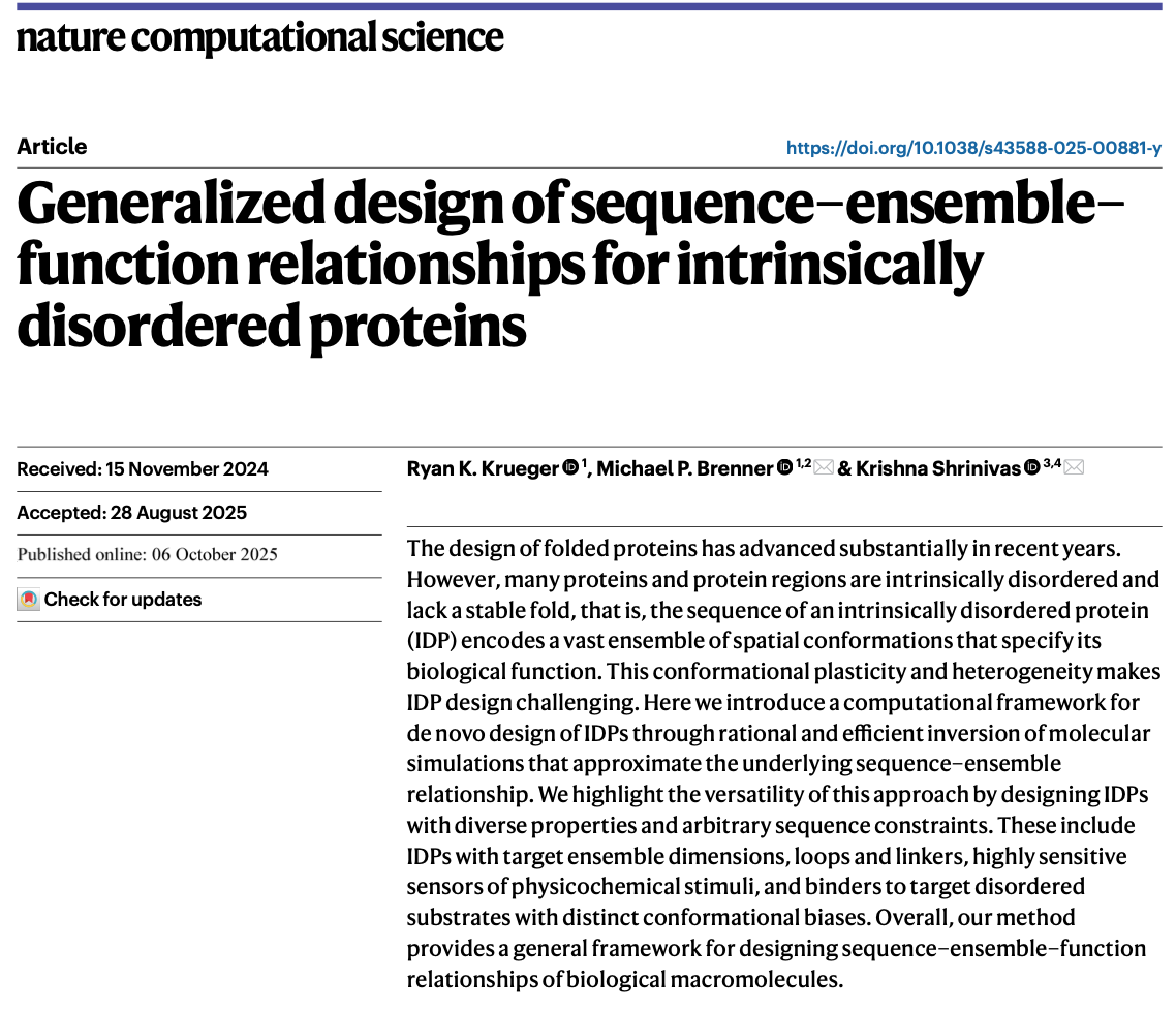 The lab’s paper on a physics-centered machine-learning framework to design shape-shifting molecules called intrinsically disordered proteins is published in Nature Computational Science, along with accompanying coverage from Northwestern and Harvard University!